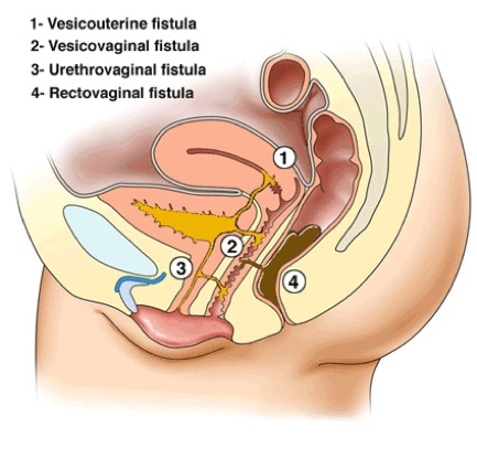 En cas de travail prolongé et d’accouchement qui n’avance pas, les tissus situés entre le vagin et sa vessie ou son rectum sont endommagés par la pression continue de la tête du bébé coincée dans le canal utérin. L’enfant est finalement libéré, il est le plus souvent décédé et les tissus morts par manque d’irrigation sanguine tombent, ce qui crée un trou à travers lequel la femme perd en permanence de l'urine, des selles ou parfois les deux. Cela entraîne à plus long terme des problèmes médicaux chroniques.